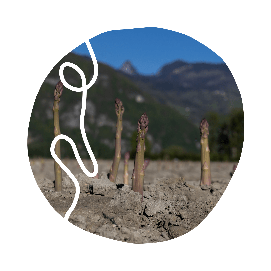 En 2014, afin de diversifier notre production, nous avons décidé de nous lancer dans la culture d’asperges. Après avoir analysé notre sol et le climat, nous avons constaté que nos terrains situés dans la plaine du Rhône étaient idéaux pour cette culture. En proposant nos asperges en vente directe, nous avons souhaité renouer le contact avec le consommateur. Nous avons ainsi récolté nos premières asperges blanches en 2015, suivies des asperges vertes en 2018 et des asperges pourpres en 2019.